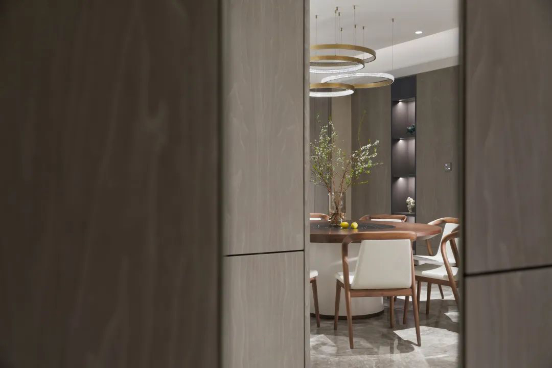 浅灰色的木饰面与同色系的落地柜形成一个整体,干净素雅,将空间的情绪与人的情感慢慢建立连接,看似平凡的表象下,优雅地表达着高贵。