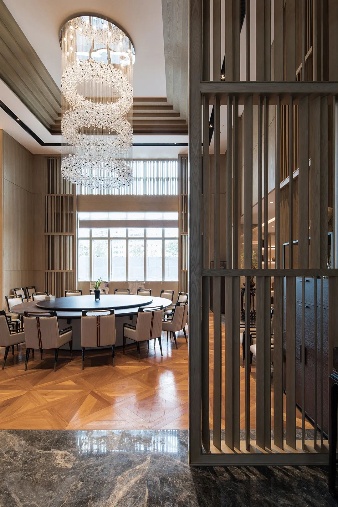 空间中以素雅格栅为底,榫卯结构巧妙穿插,镂空的造型,在光晕流转间呈现有序又无序的秩序感,朦胧之中尽显雅韵。