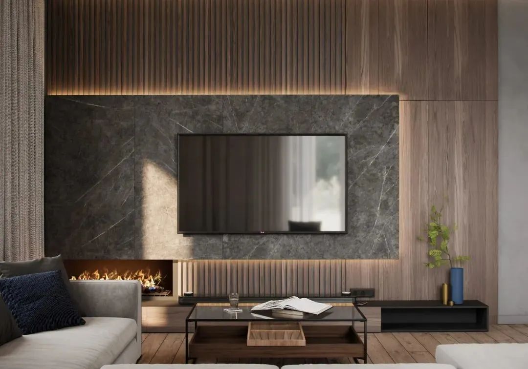围绕、裹挟、涤心,阅尽繁华,复归淡然;雕刻山纹云理的大理石壁面与古铜色不锈钢屏风交织,以独特的感官美学,满足居者对文化与生活的双重需求。